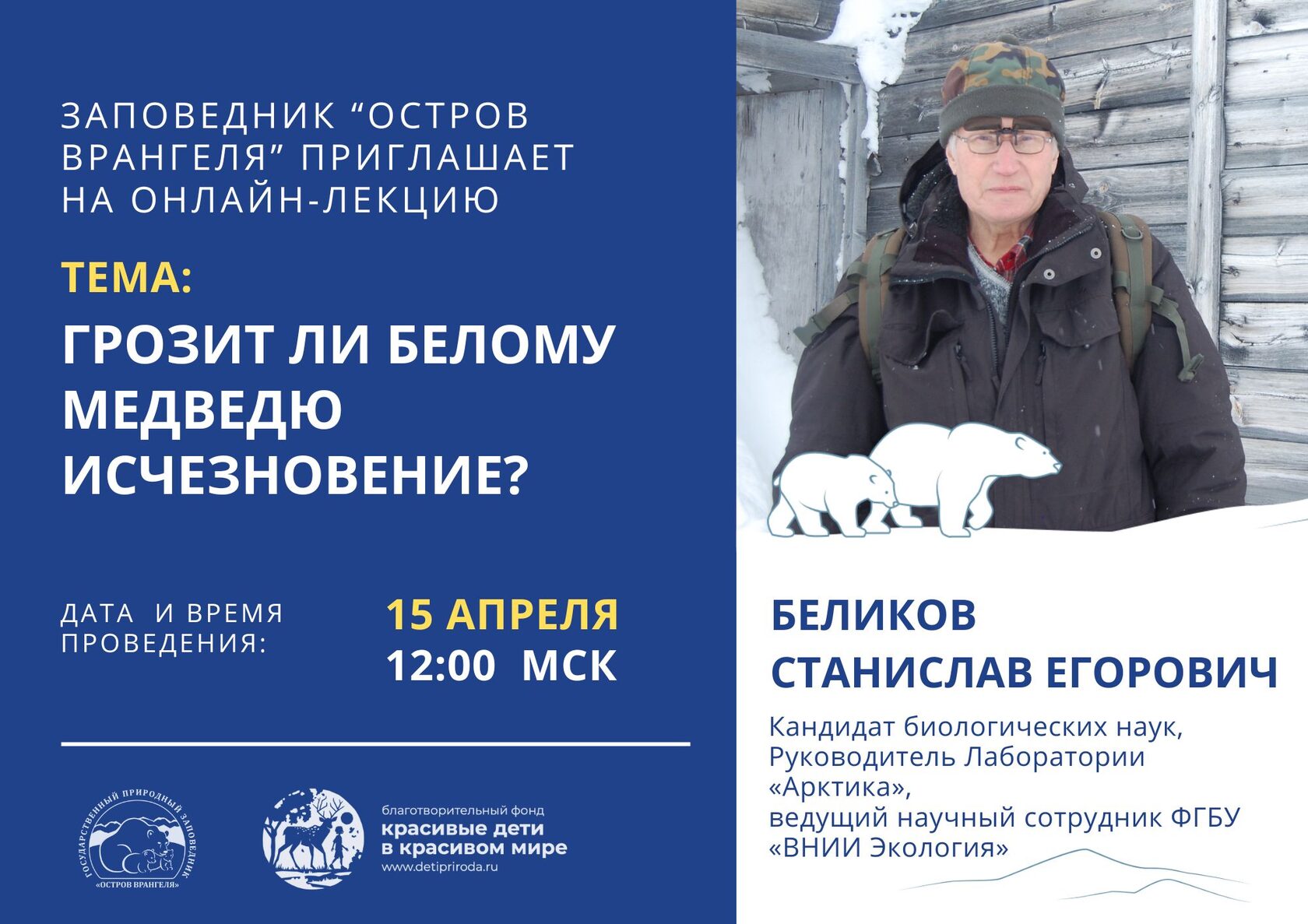 На очереди — вторая лекция из нашей просветительской серии. Мы поговорим с выдающимся специалистом по белым медведям — Станиславом Егоровичем Беликовым, кандидатом биологических наук, руководителем Лаборатории «Арктика», ведущим научным сотрудником ФГБУ «ВНИИ Экология».